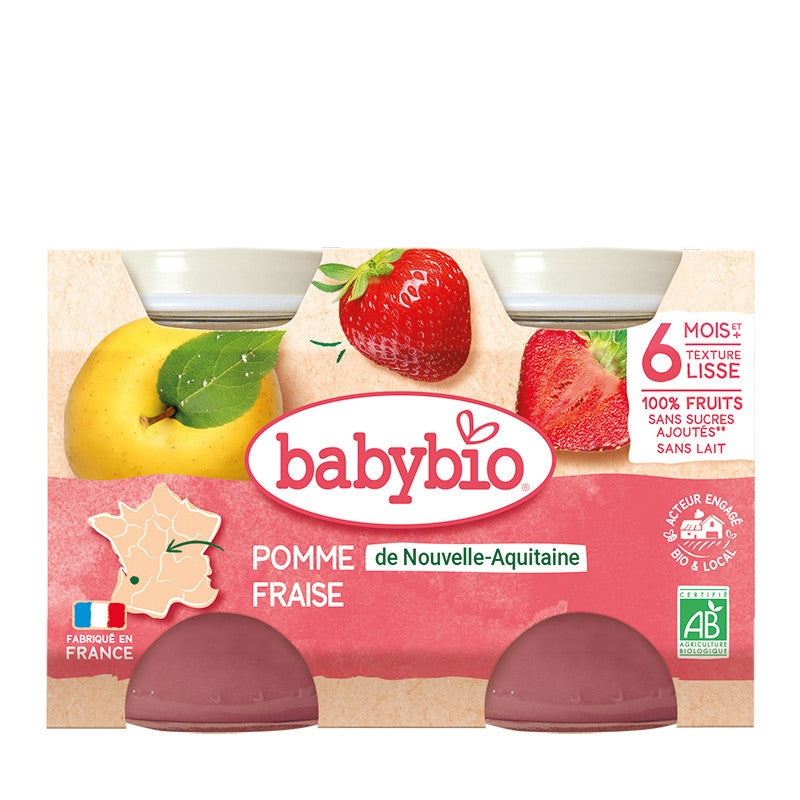 Après la pomme de reinette et la pomme d’api, découvrez la pomme de Nouvelle-Aquitaine, tendre, savoureuse et bio, comme tous nos ingrédients. Les notes légèrement sucrées des fraises viennent compléter ce petit pot, parfait pour le dessert de Bébé.