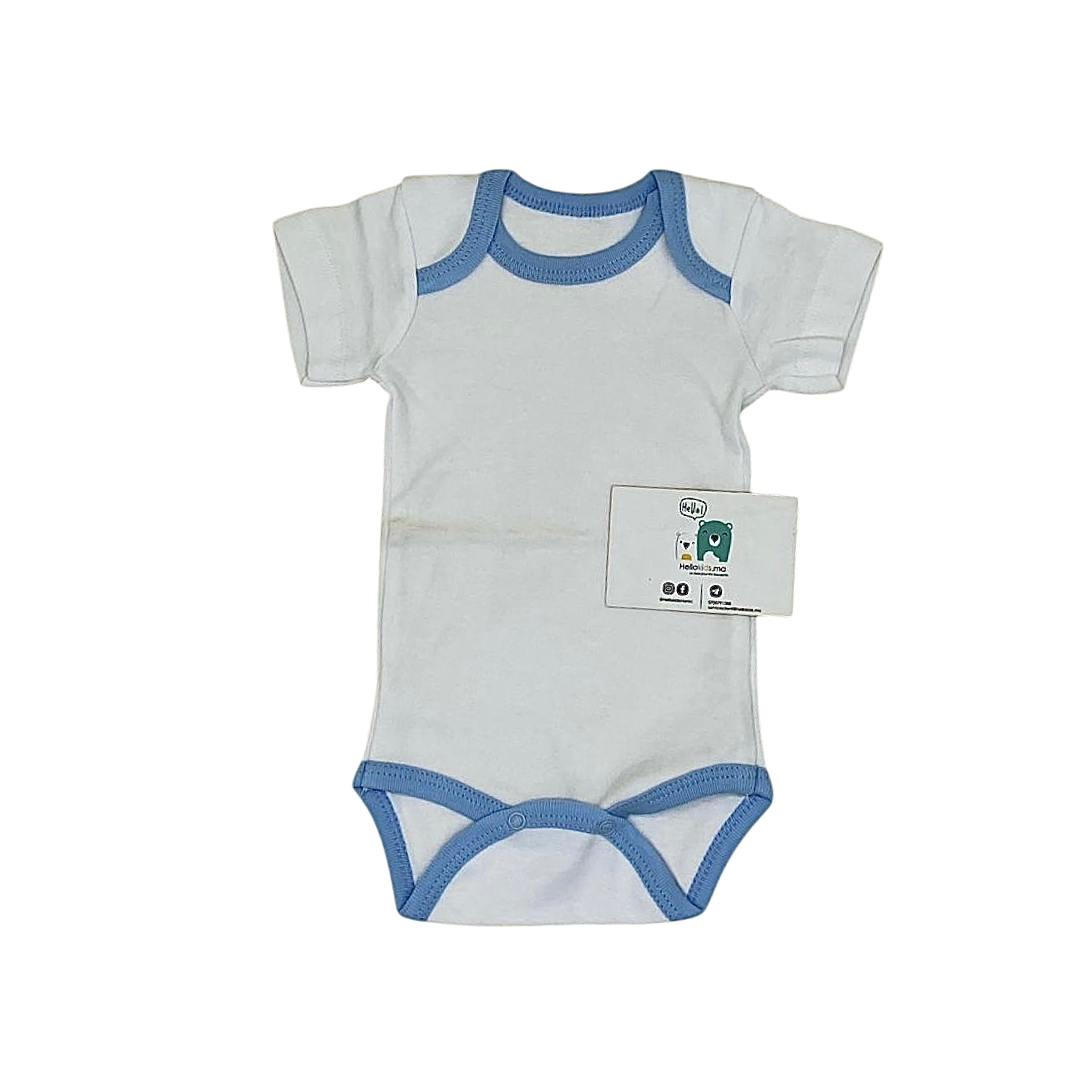 Body bébé garçon demi-manche – Blanc avec col et attaches bleus – 100% coton