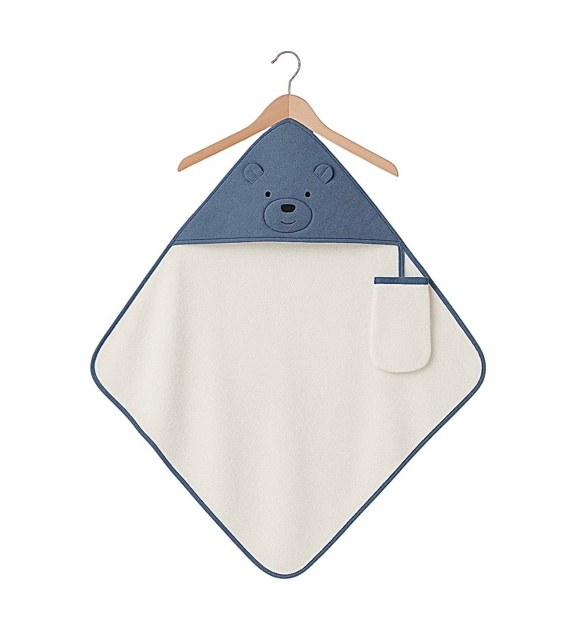 Le gant assorti, blanc avec une bordure bleu marine élégante, est inclus pour un nettoyage tout en douceur. Un ensemble idéal pour les premiers instants de toilette, à la maison ou en cadeau de naissance.