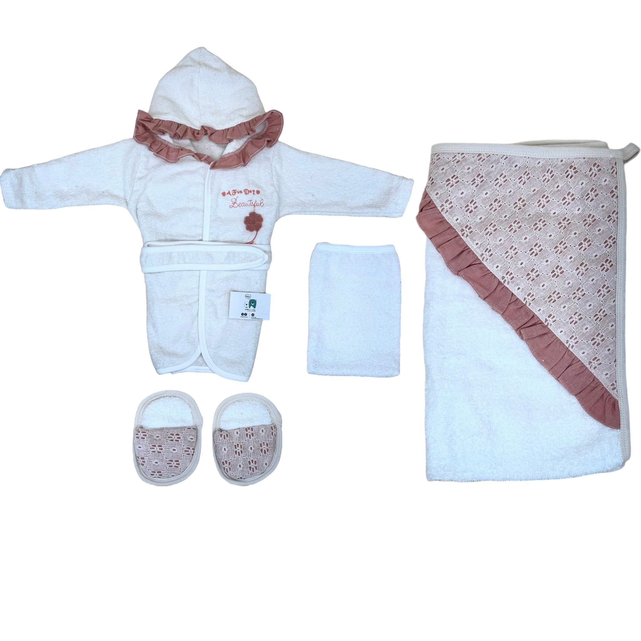Le Coffret sortie de bain Beautiful girly 4 pcs pour votre bébé fille est composé d'un peignoir, serviette de bain, chaussons et d'un gant.