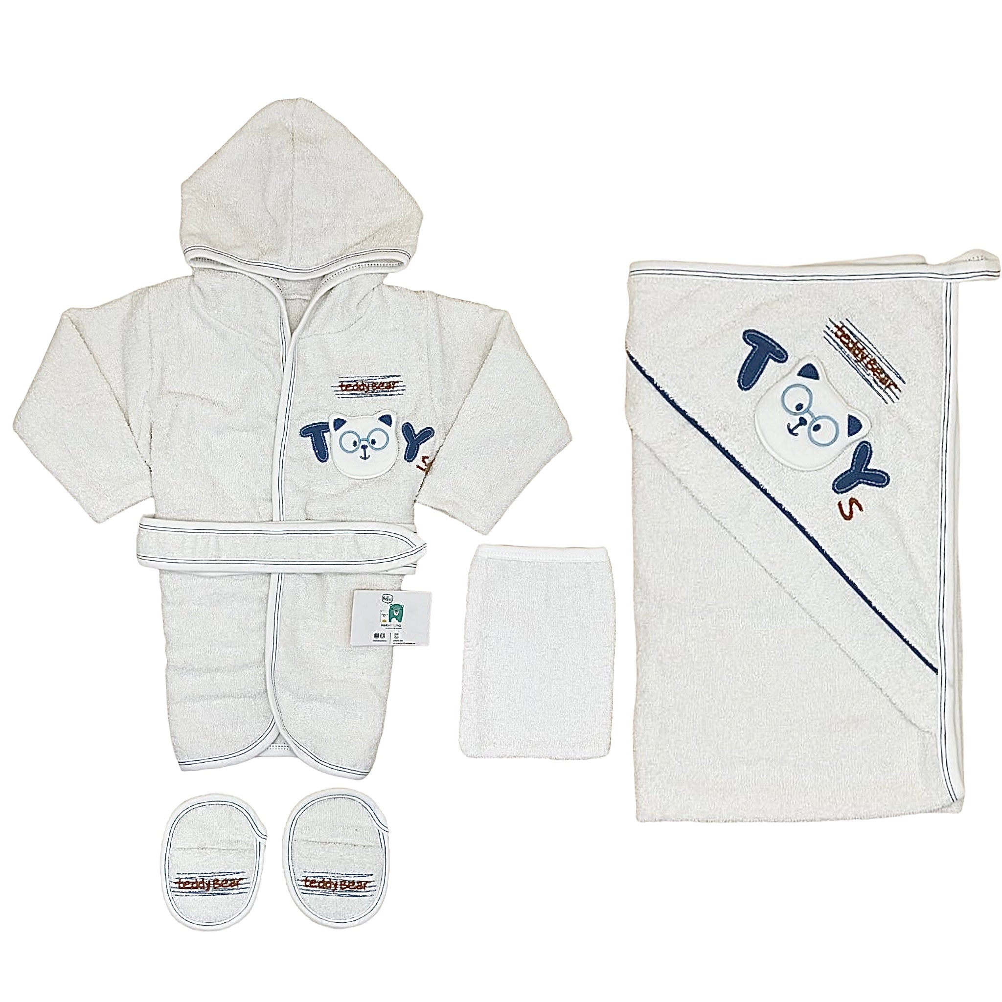 Le Coffret sortie de bain TOYS 4 pcs pour votre bébé garçon est composé d'un peignoir avec ceinture, serviette de bain, un gant et des chaussons. Il est choupi grâce à son design et à une qualité très douce pour votre bébé.