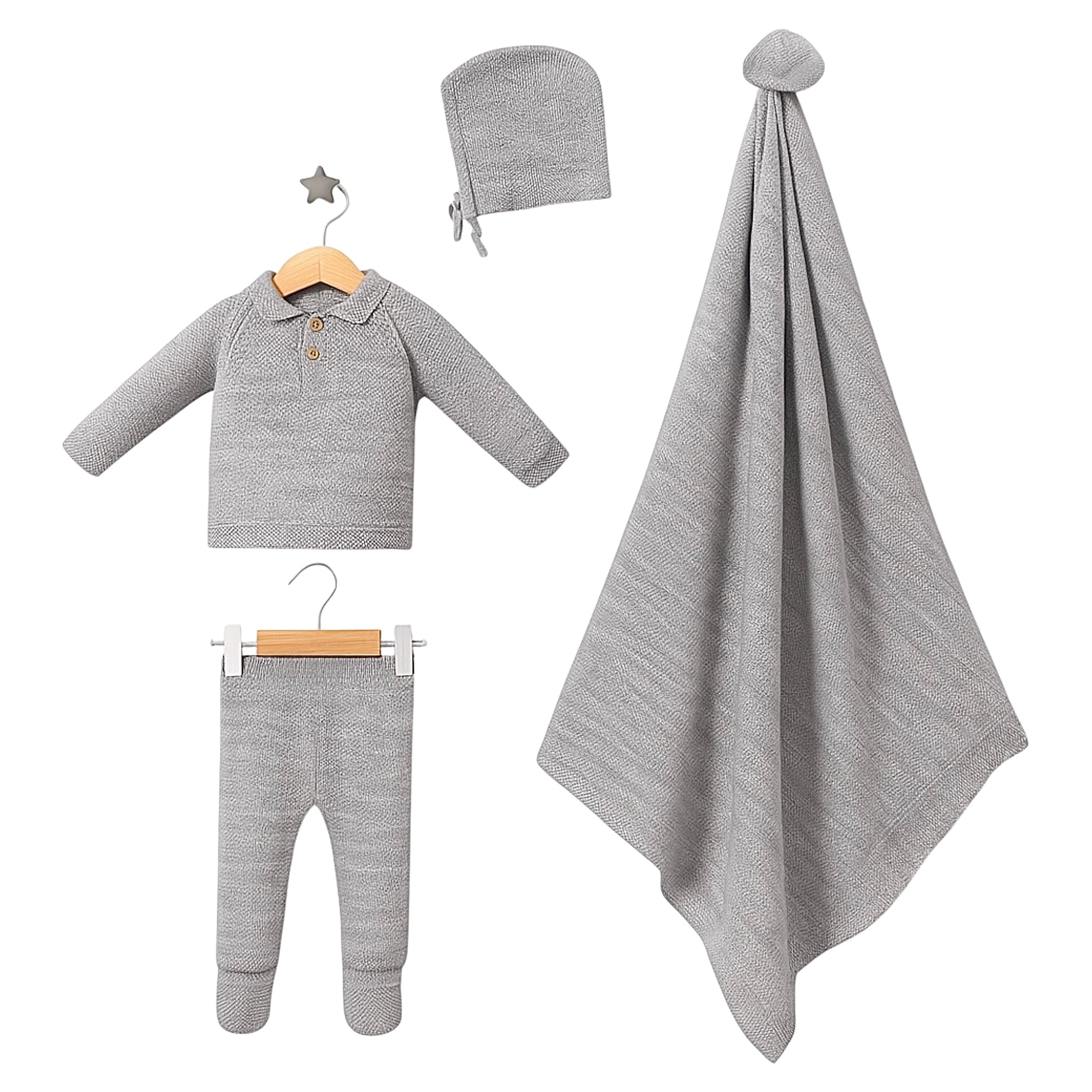 Composé d’un haut à col avec boutons en bois, d’un pantalon avec pieds intégrés, d’un bonnet assorti et d’une grande couverture en maille tricotée, ce set unisexe gris perle est une valeur sûre pour l’automne et l’hiver.