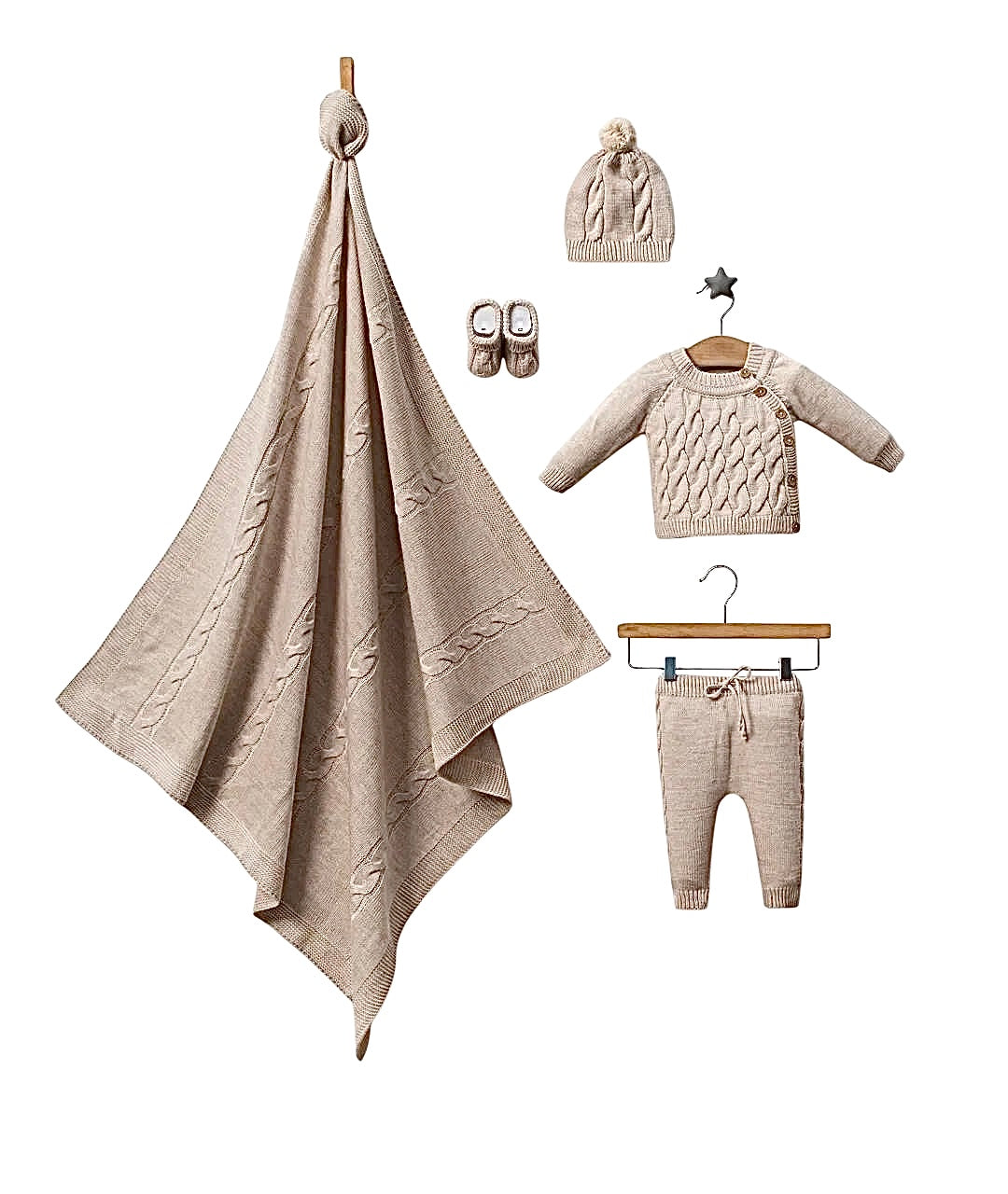 Offrez à votre bébé douceur, chaleur et élégance avec ce magnifique coffret naissance 5 pièces tricoté, idéal pour la saison automnale.