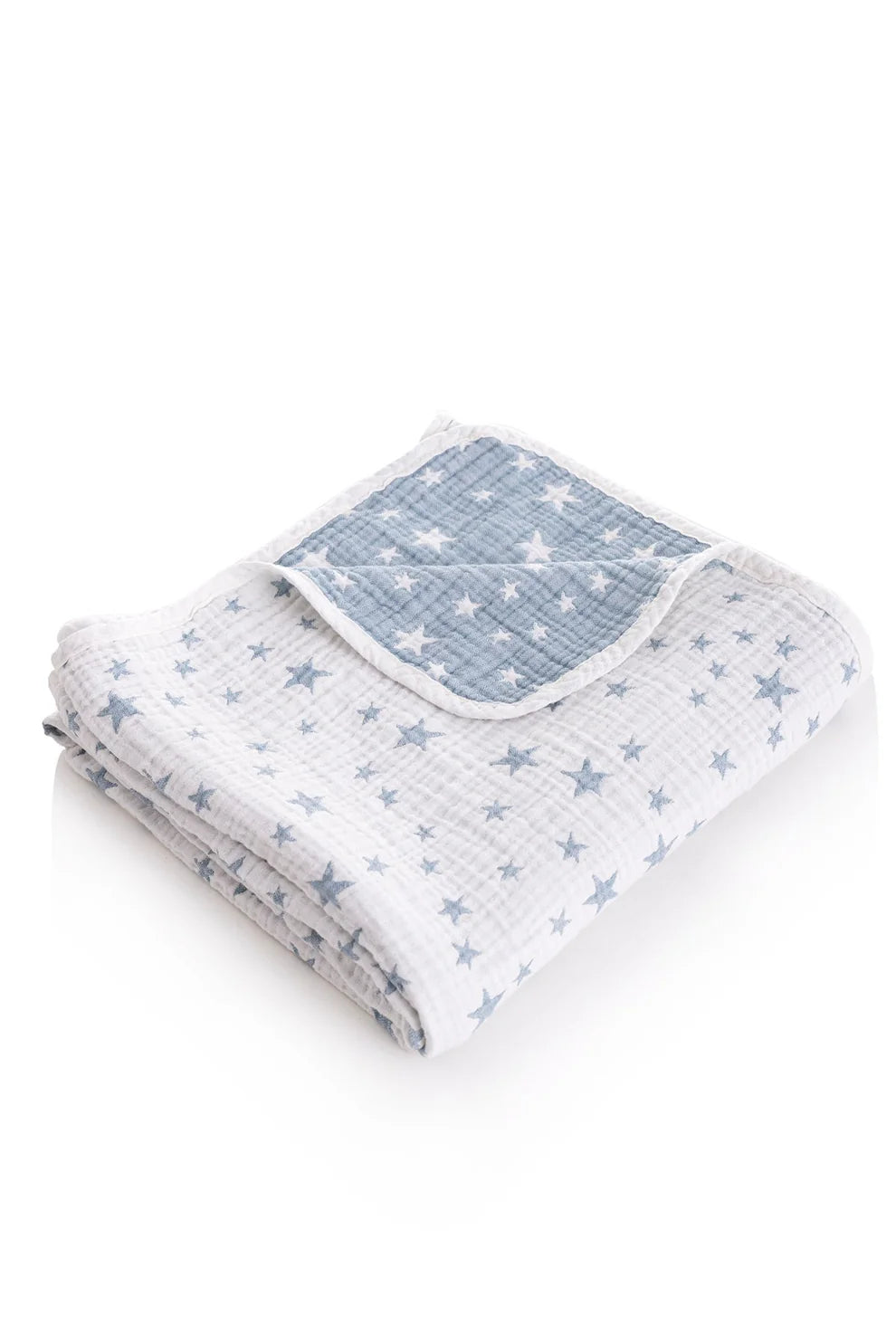 Couverture en mousseline jacquard 4 épaisseurs – Motif étoiles bleu (110 x 110 cm)