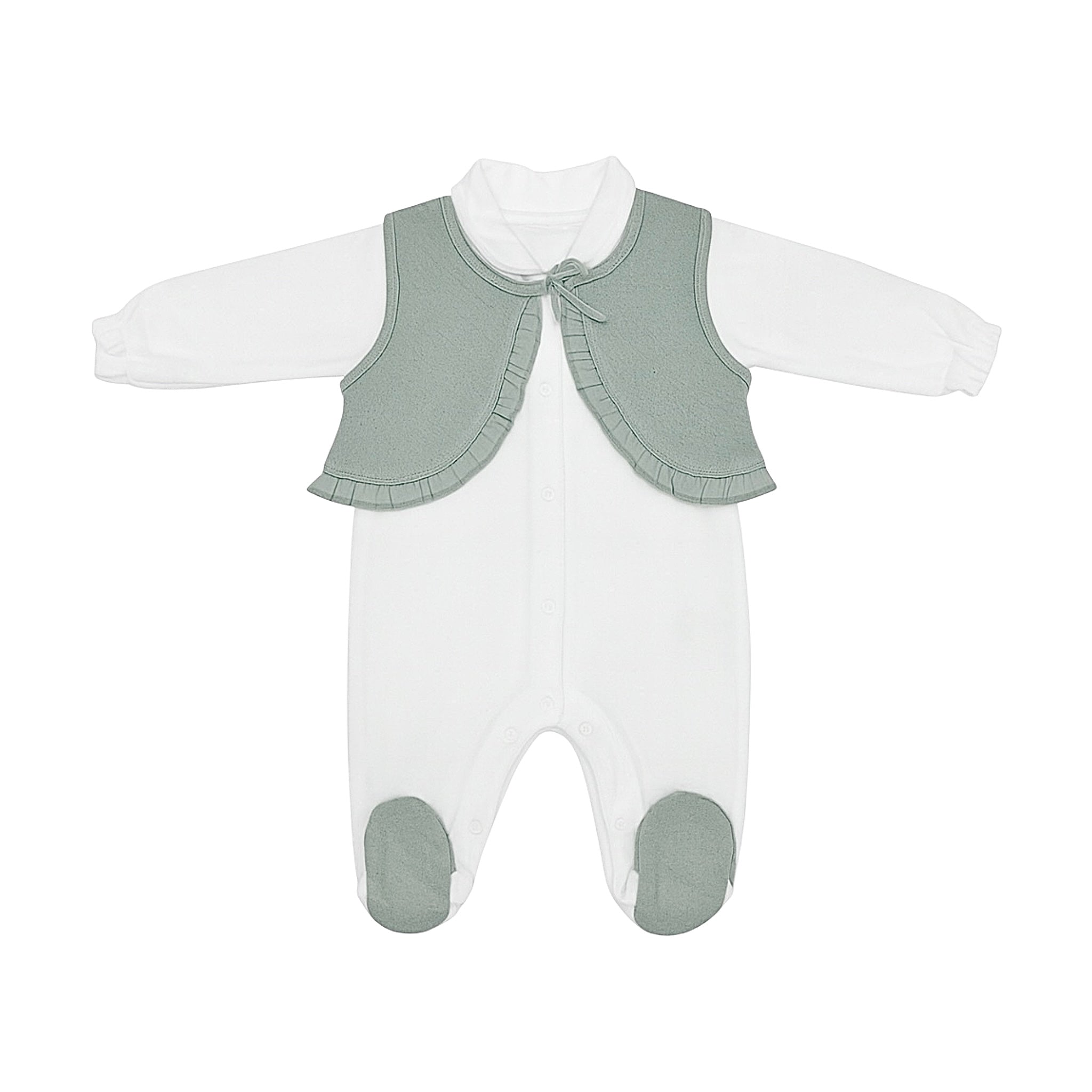Son design raffiné se distingue par un adorable gilet intégré à volants (froufrou), sublimé par un petit nœud élégant pour un look chic et chaleureux.