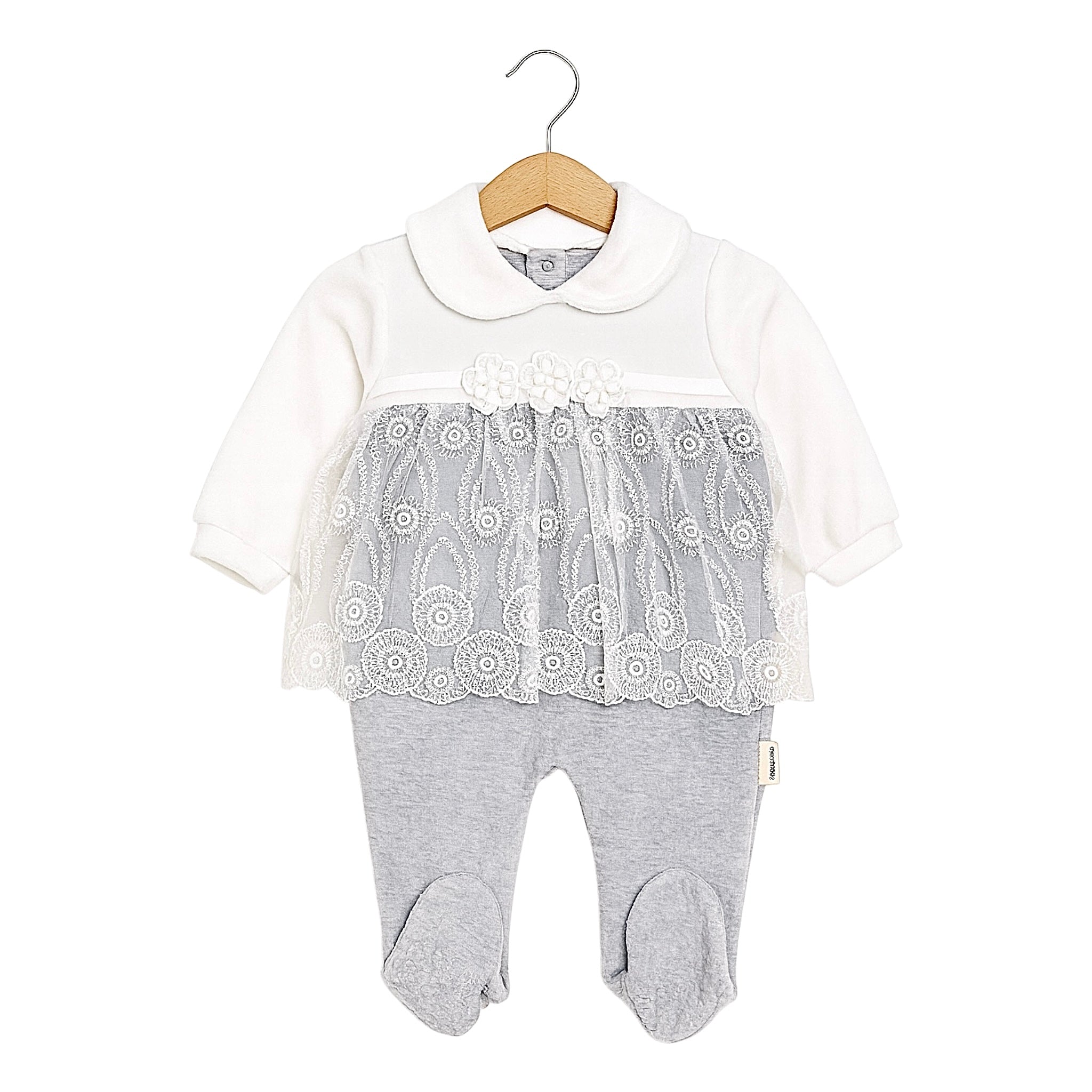 Cette grenouillère se distingue par son haut blanc à col rond orné de petites fleurs délicates, et sa jupe en tulle brodé effet dentelle, qui apporte une touche de charme et d’élégance unique.