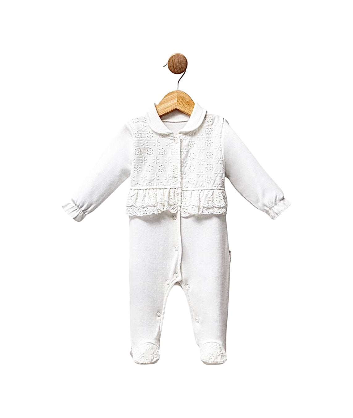 En blanc pur, cette grenouillère d'une élégance rare est ornée d’un col à froufrou délicat et de petites fleurs sur le dessus, pour un look doux, chic et ultra-féminin. Le froufrou centré apporte une touche de charme irrésistible.