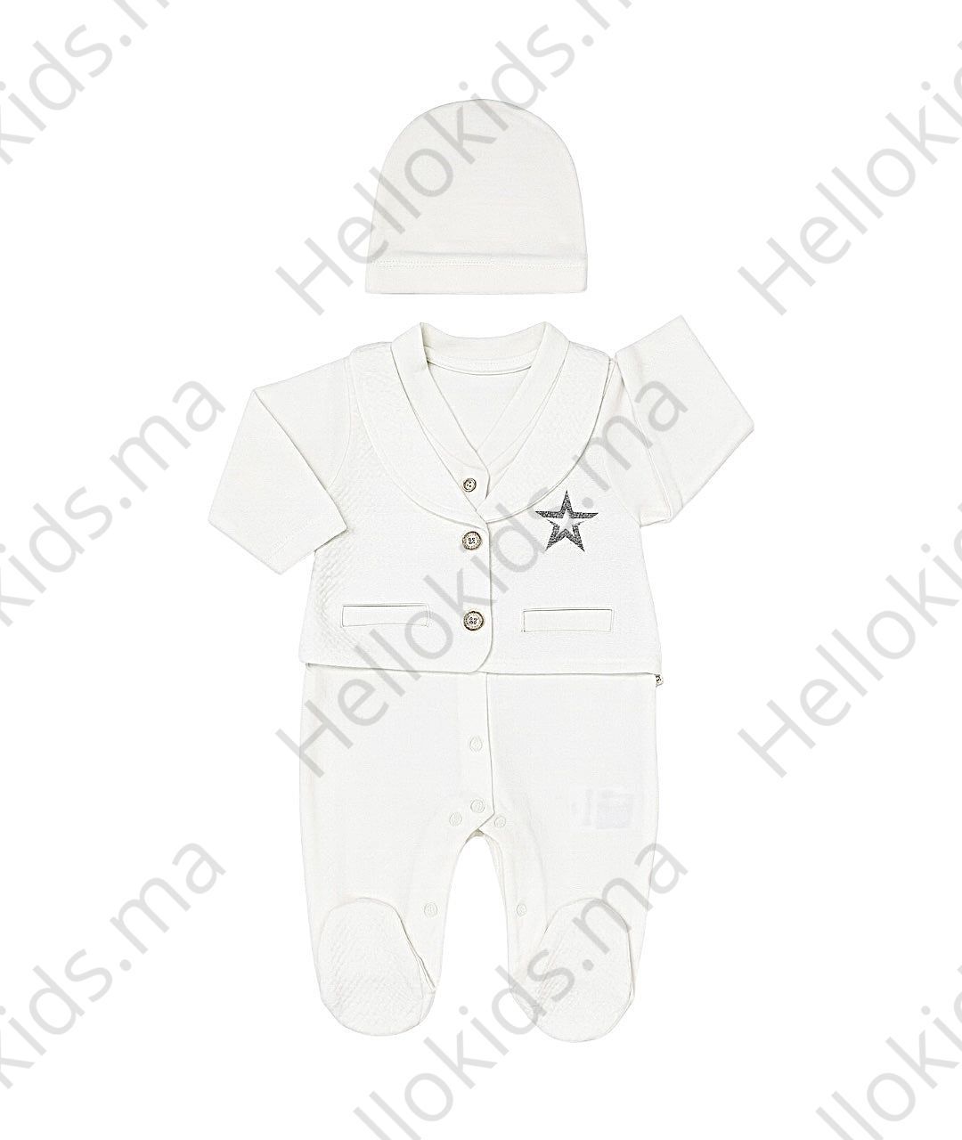 Retrouvez cette grenouillère étoile sur gilet coton en exclusivité sur hellokids.ma, votre boutique spécialisée dans les vêtements et accessoires pour bébé.