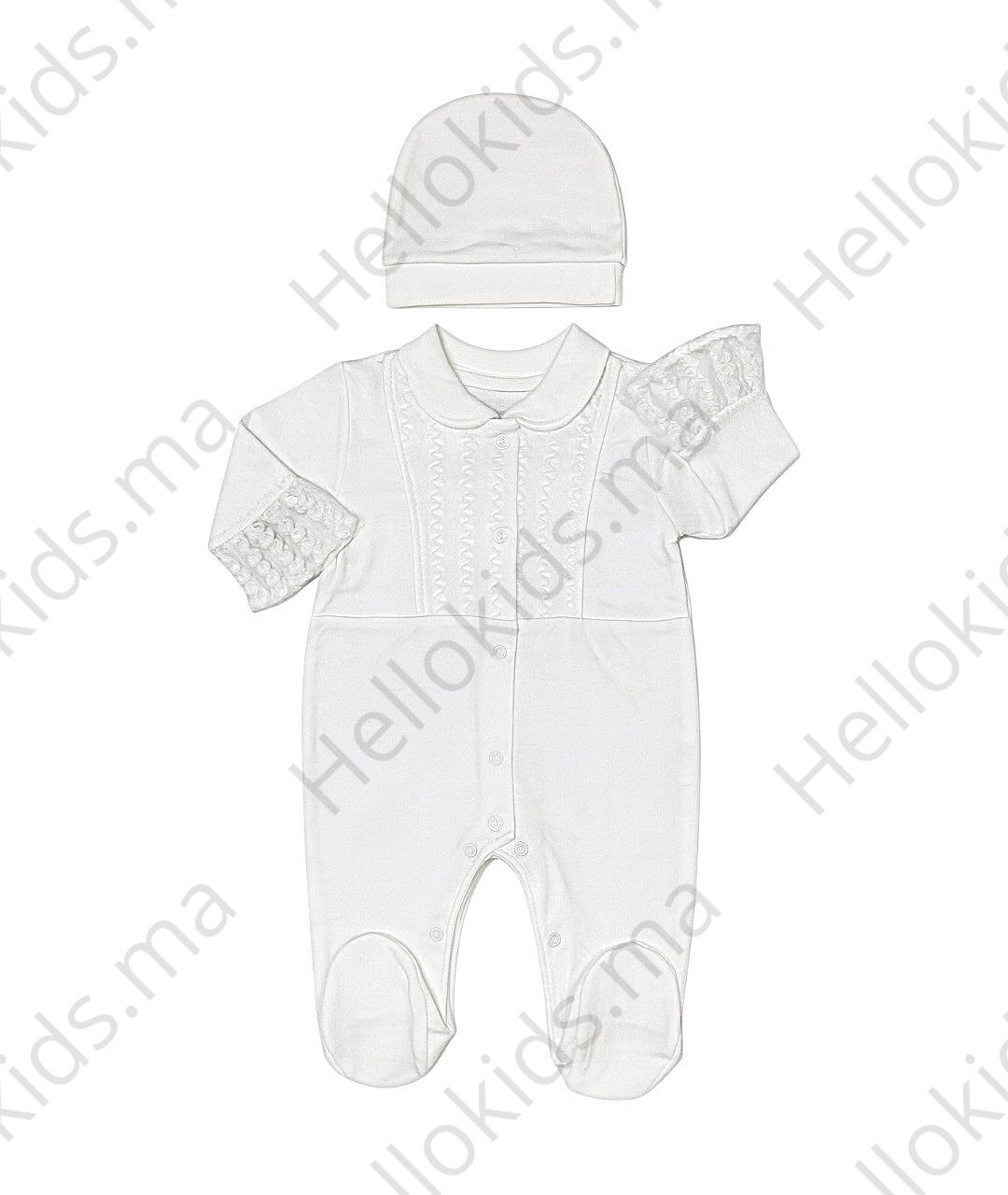 Disponible dès maintenant sur hellokids.ma, cette grenouillère full white froufrou côtés boutons centrés est un indispensable du dressing de naissance. Offrez à votre bébé confort et élégance dès ses premiers instants.