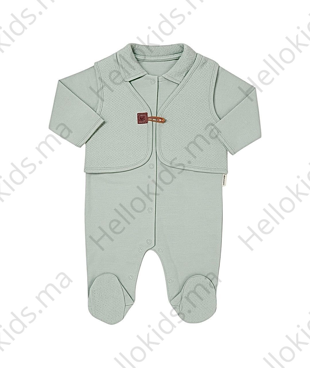 Ce modèle se distingue par son gilet intégré au style élégant, qui donne l’impression d’une petite tenue habillée. La fermeture à pressions sur le devant facilite l’habillage et le change. Son coloris vert tendre apporte une touche moderne et raffinée, idéale pour un look chic dès la naissance.