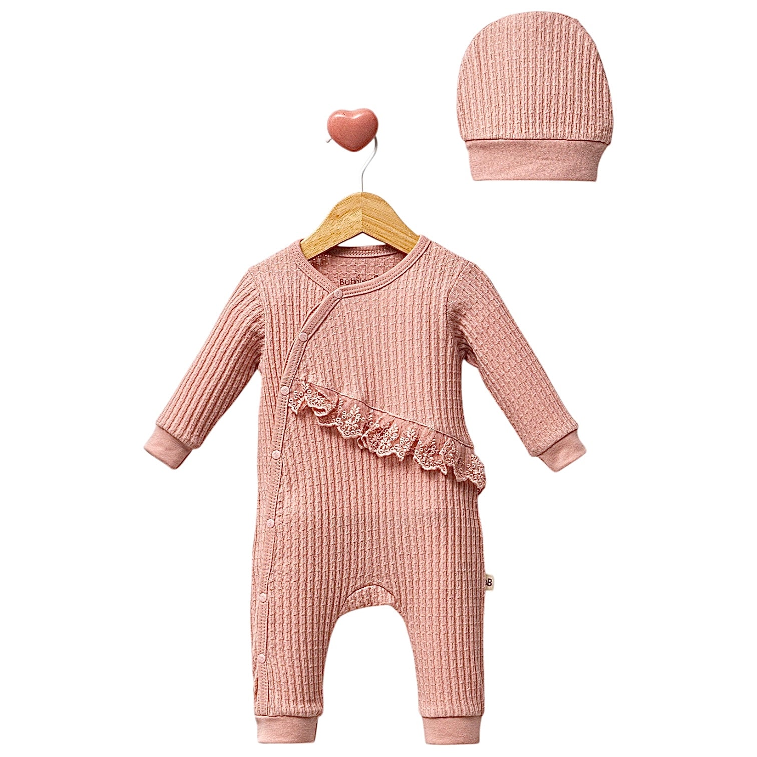 Cette grenouillère se distingue par sa jolie finition en dentelle sur le devant, qui apporte une touche sophistiquée et unique. Sa couleur douce et tendance en fait une pièce idéale pour bébé fille, parfaite pour les sorties comme pour les moments cocooning.