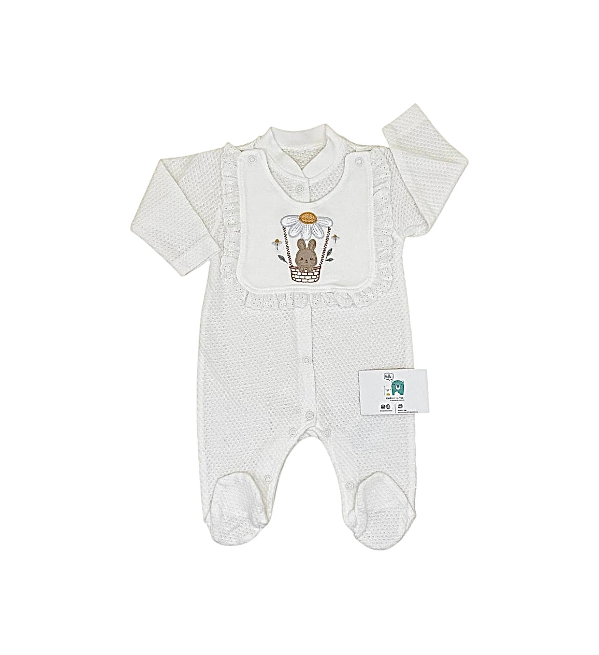 Disponible en deux teintes délicates, blanc et mint, cette grenouillère se distingue par son bavoir intégré orné d’un motif enchanteur : une lapine souriante voyageant dans une montgolfière en forme de fleur.