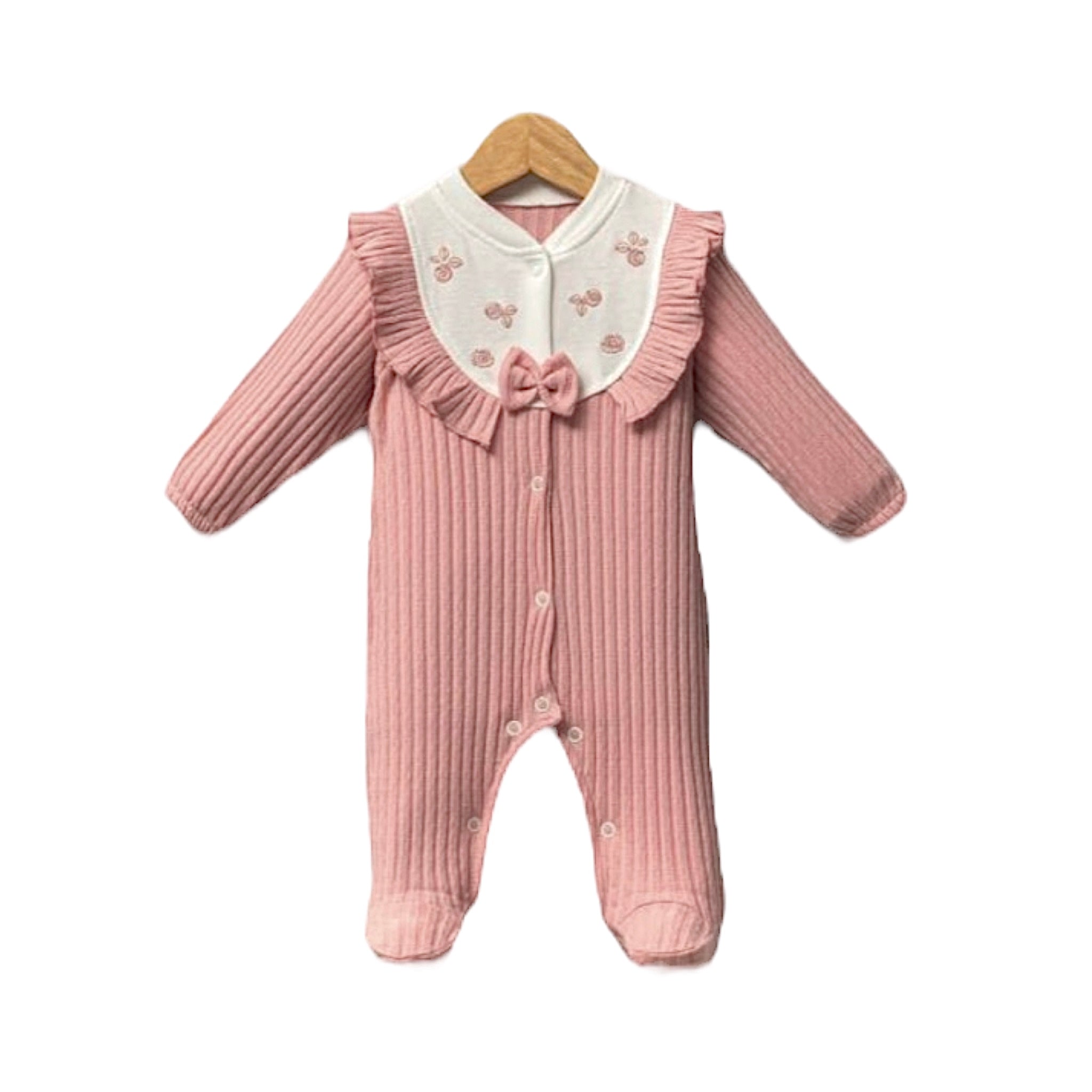 Le col orné d’un petit nœud fleuri et de froufrous sur les côtés ajoute une note romantique et féminine, idéale pour les premiers jours de bébé.