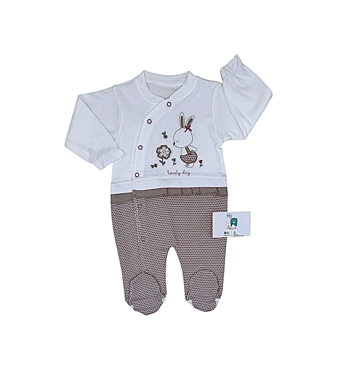 Disponible en deux délicates combinaisons de couleurs : blanc-beige et mint-beige, cette grenouillère est ornée d’un adorable motif représentant une petite lapine en train de sentir une fleur, apportant une touche de tendresse et d’élégance.