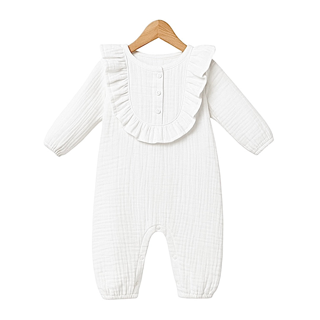 Craquez pour l’élégance intemporelle de cette grenouillère full white en mousseline, pensée pour les petites princesses.