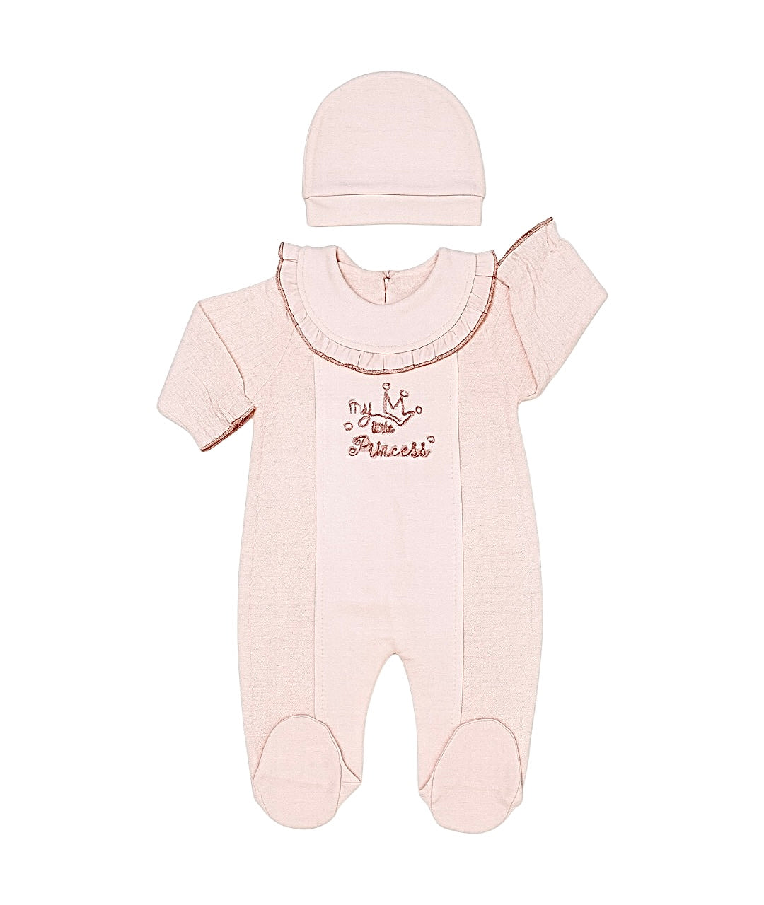 Cette grenouillère rose tendre est ornée d’une jolie broderie “My Little Princess” accompagnée d’une petite couronne. Son col plissé au style raffiné et ses finitions délicates en font une tenue parfaite pour habiller bébé avec élégance tout en restant pratique.