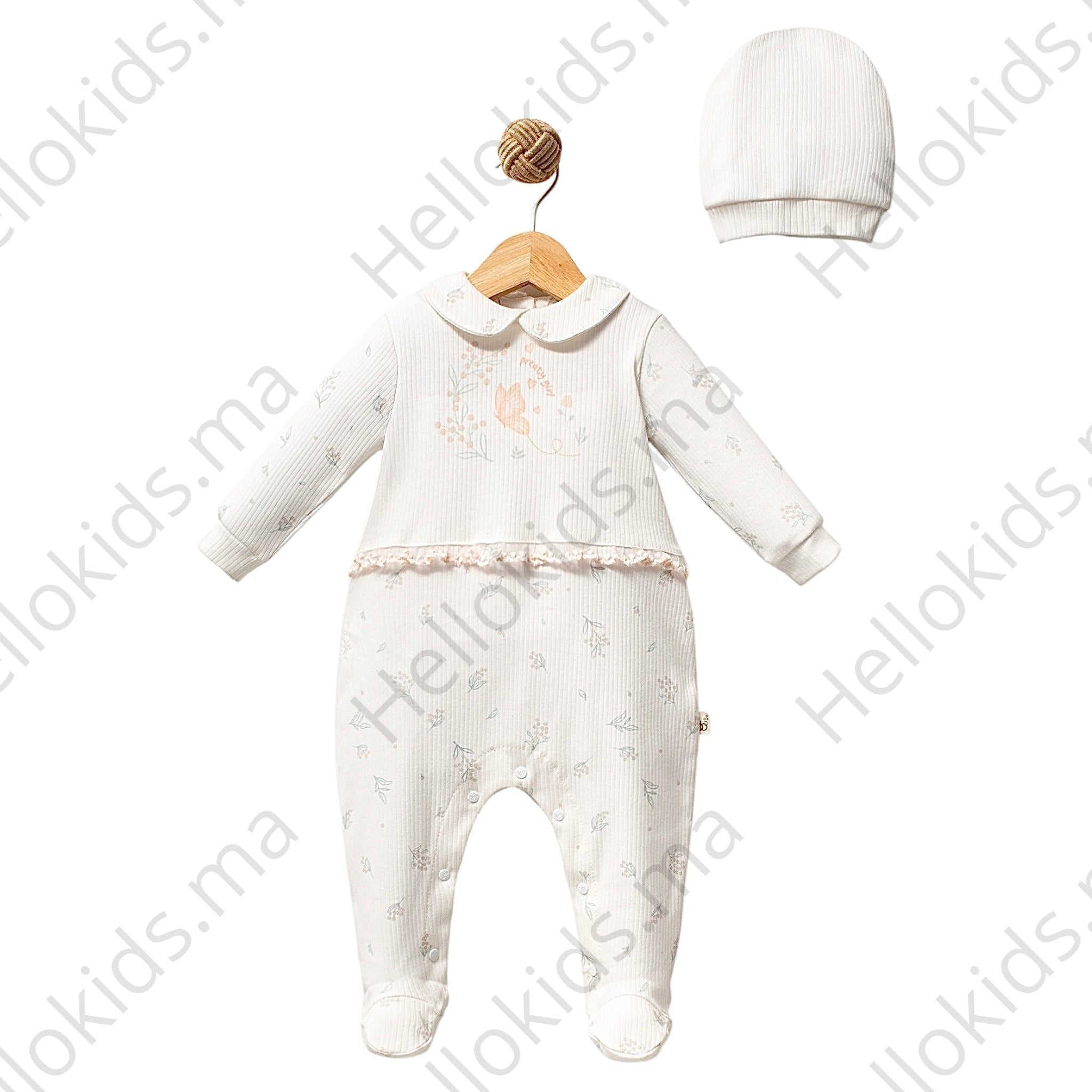 Disponible uniquement sur Hellokids.ma, cette grenouillère Pretty Girl coton bio avec bonnet est le choix parfait pour habiller votre bébé fille avec style, confort et sécurité.