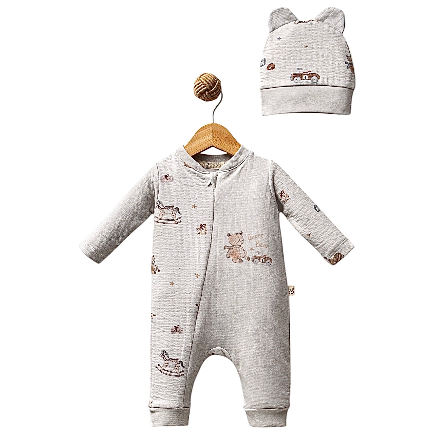 Cette grenouillère séduit par ses motifs délicats inspirés de l’univers enfantin : petits oursons, voitures et éléments ludiques. Sa couleur douce et neutre en fait un choix parfait pour bébé fille ou garçon.