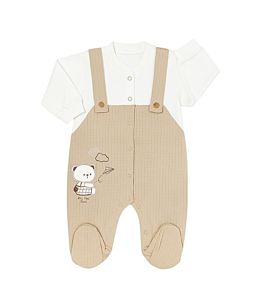 En blanc et beige tout doux, cette grenouillère adorable allie confort et style avec son design façon salopette et son petit motif nounours "happy" trop craquant. Un look tendre et soigné, parfait pour les premiers mois de bébé.