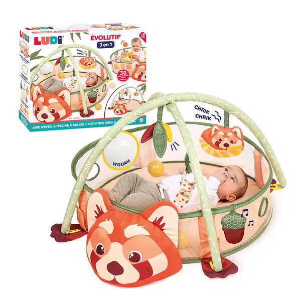 Avec ses couleurs douces et ses motifs inspirés du panda roux, ce tapis crée une atmosphère joyeuse et apaisante. Les textures variées, les accessoires suspendus et les balles colorées encouragent bébé à explorer, toucher, attraper et développer sa coordination.