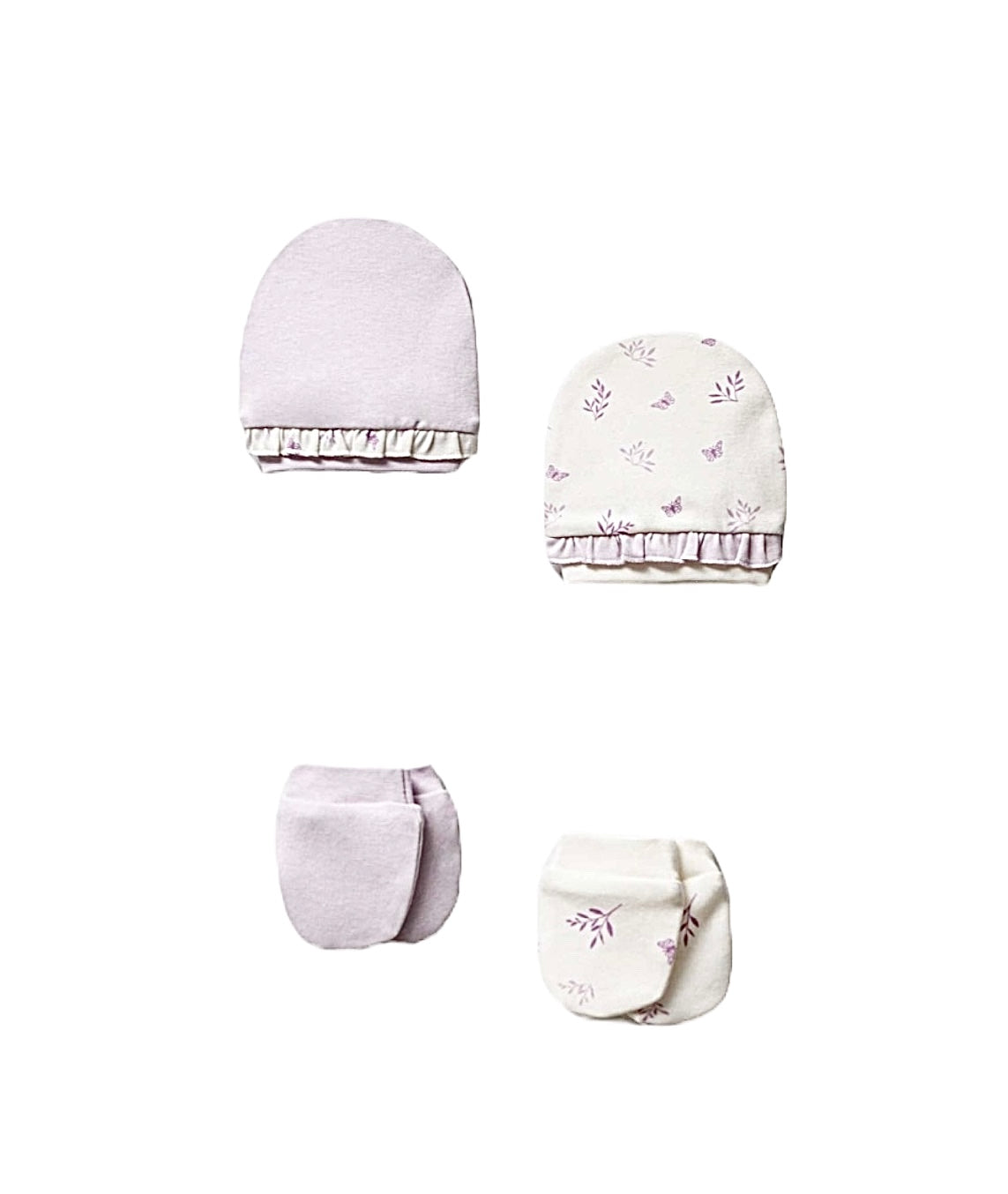 Super Pack 4 pièces Bonnets & Moufles Papillons Fleury – Mauve & Blanc – 0 à 3 mois