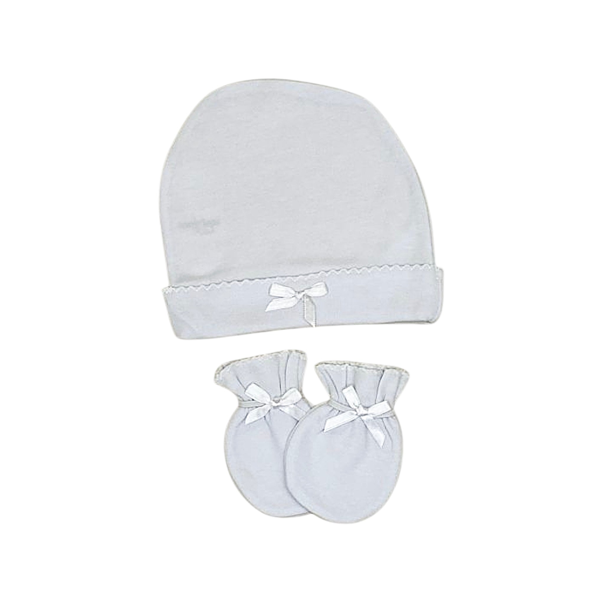 Ajoutez une touche de douceur et d’élégance à la tenue de votre nouveau-né avec ce pack bonnet et moufles assortis. En coloris blanc pur, chaque pièce est délicatement ornée de jolis petits nœuds, pour un style craquant dès la naissance.