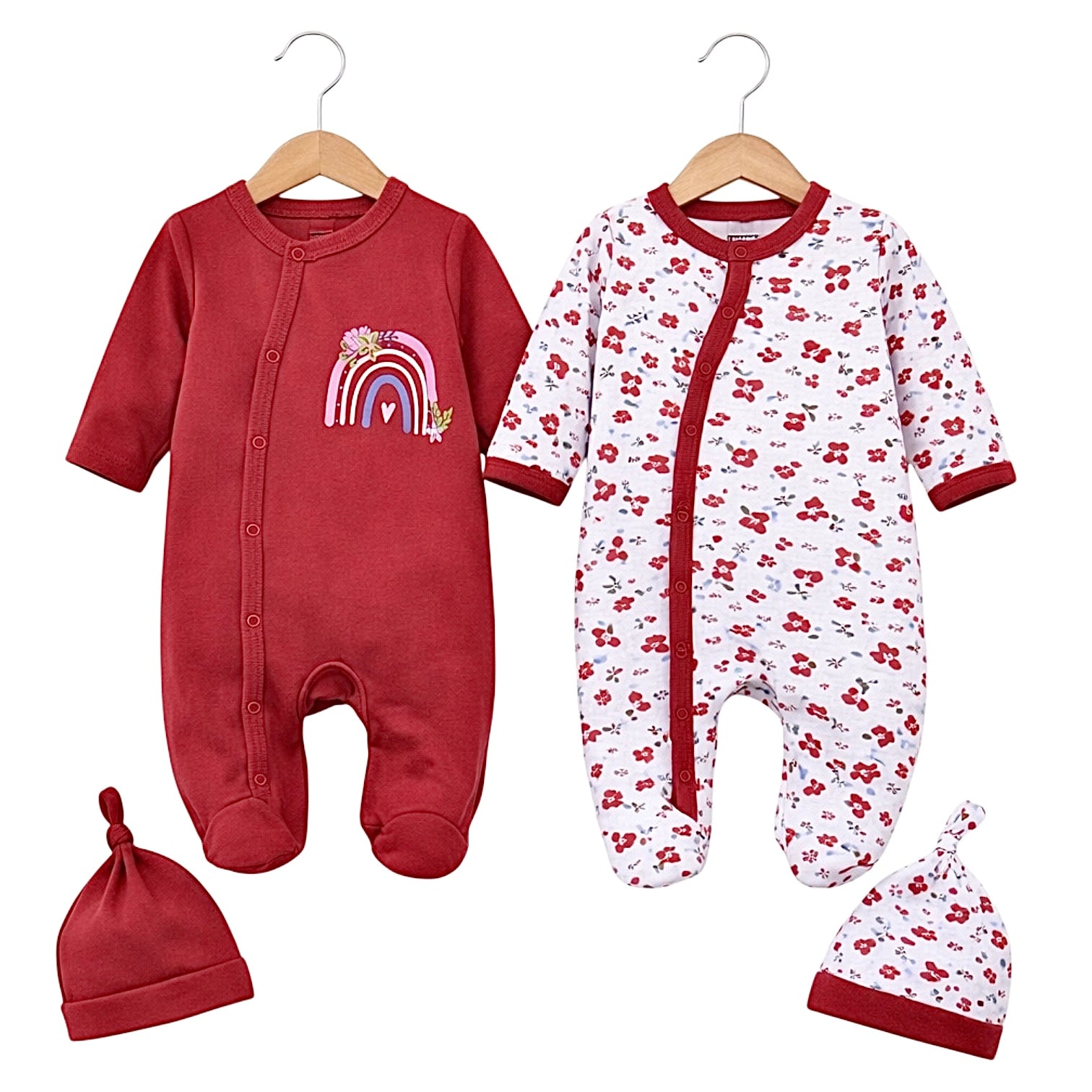 Ce pack comprend deux grenouillères assorties : une unie décorée d’un joli arc-en-ciel et une à imprimé fleuri délicat, accompagnées de deux bonnets coordonnés. L’ensemble crée une tenue complète, féminine et raffinée.