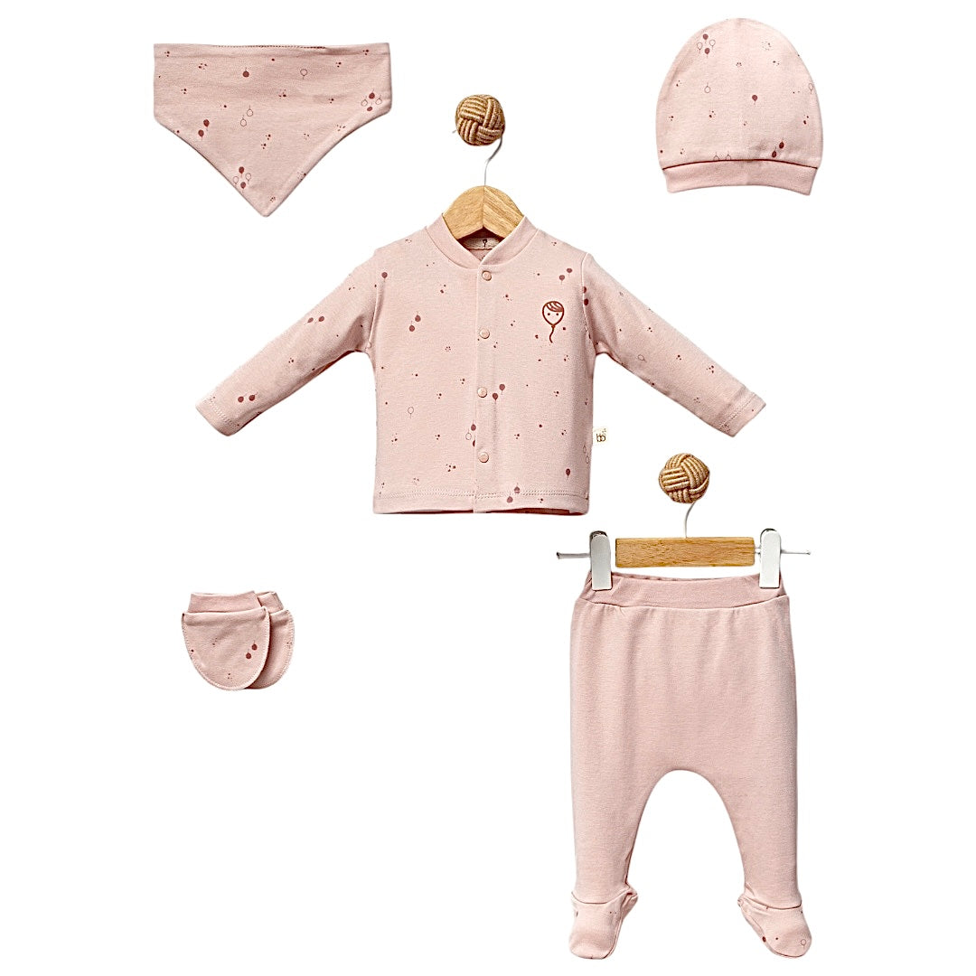 Offrez à votre petite princesse un ensemble à la fois chic et confortable avec le Pack naissance Ballons. Ce pack 5 pièces, disponible en rose foncé ou rose clair, est conçu en coton ultra-doux pour offrir à bébé un confort optimal dès ses premiers jours. Les motifs de ballons qui ornent l’ensemble apportent une touche ludique et festive, parfaite pour accueillir bébé avec douceur.