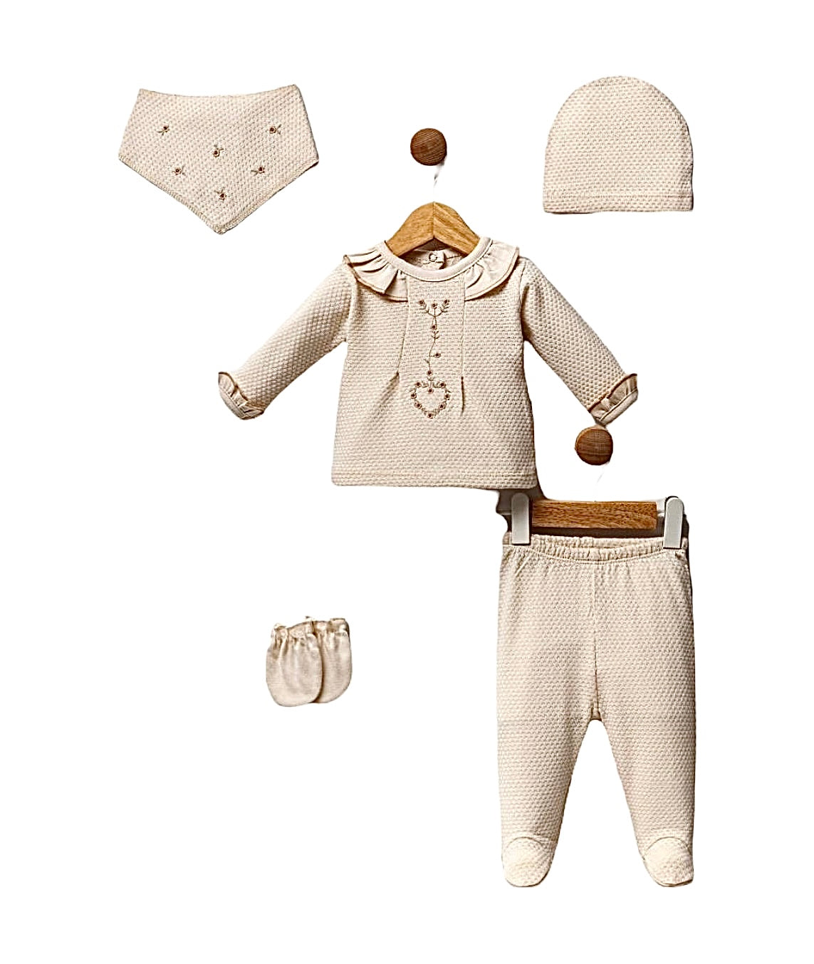 Découvrez le superbe Pack Naissance Cœur Centré 5 pièces, conçu spécialement pour habiller votre bébé avec douceur et élégance. Cet ensemble délicat est disponible en deux variantes de couleur : un blanc éclatant rehaussé de nuances beige et un ton saumon plein de charme.