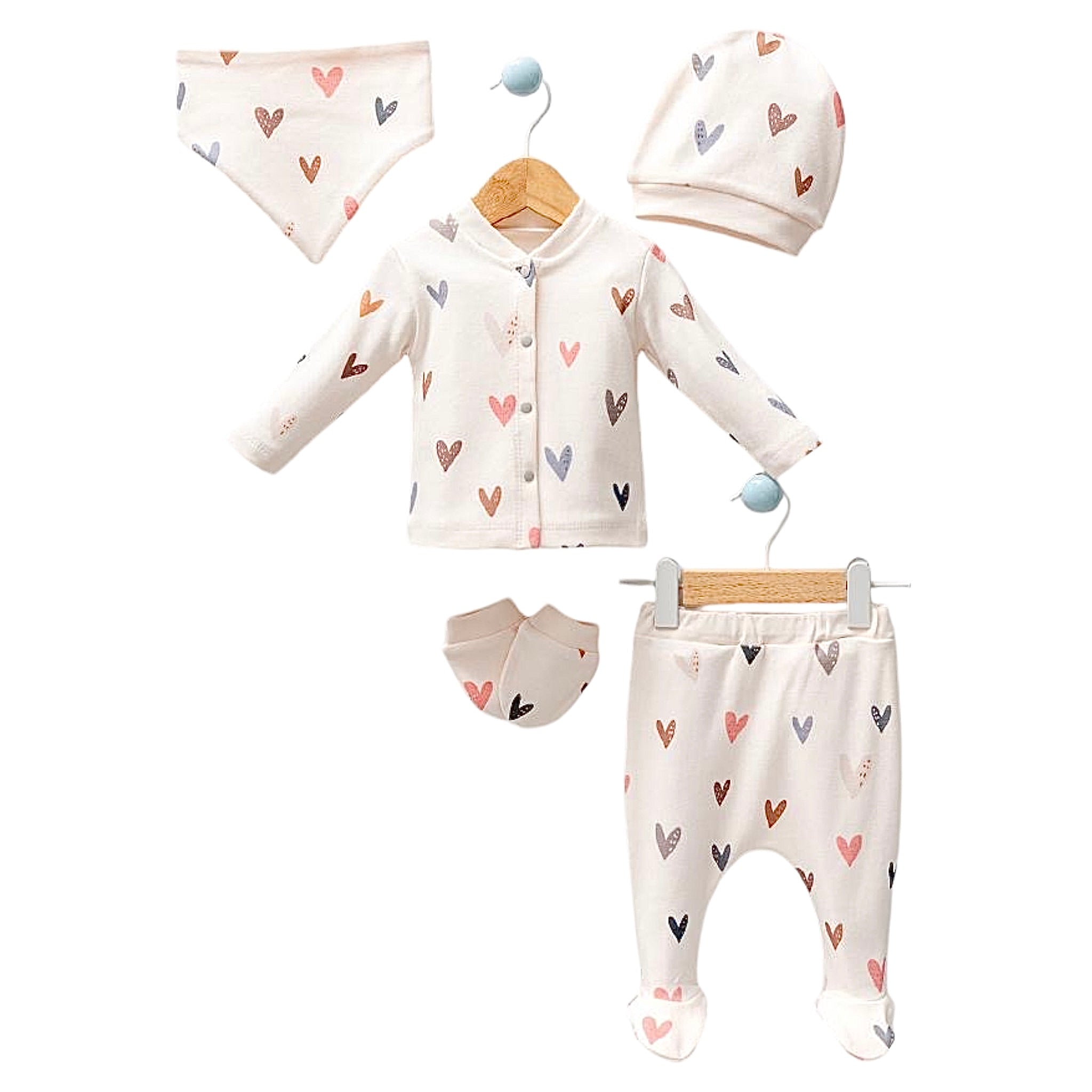 Design Adorable en Blanc Nacré avec Motifs Cœurs : Ce pack est composé de cinq pièces en coton bioorganic, toutes en blanc nacré ornées de nombreux petits cœurs. Ce design charmant et romantique apportera une touche de douceur et d’élégance à votre bébé, tout en étant parfaitement adapté pour les filles.