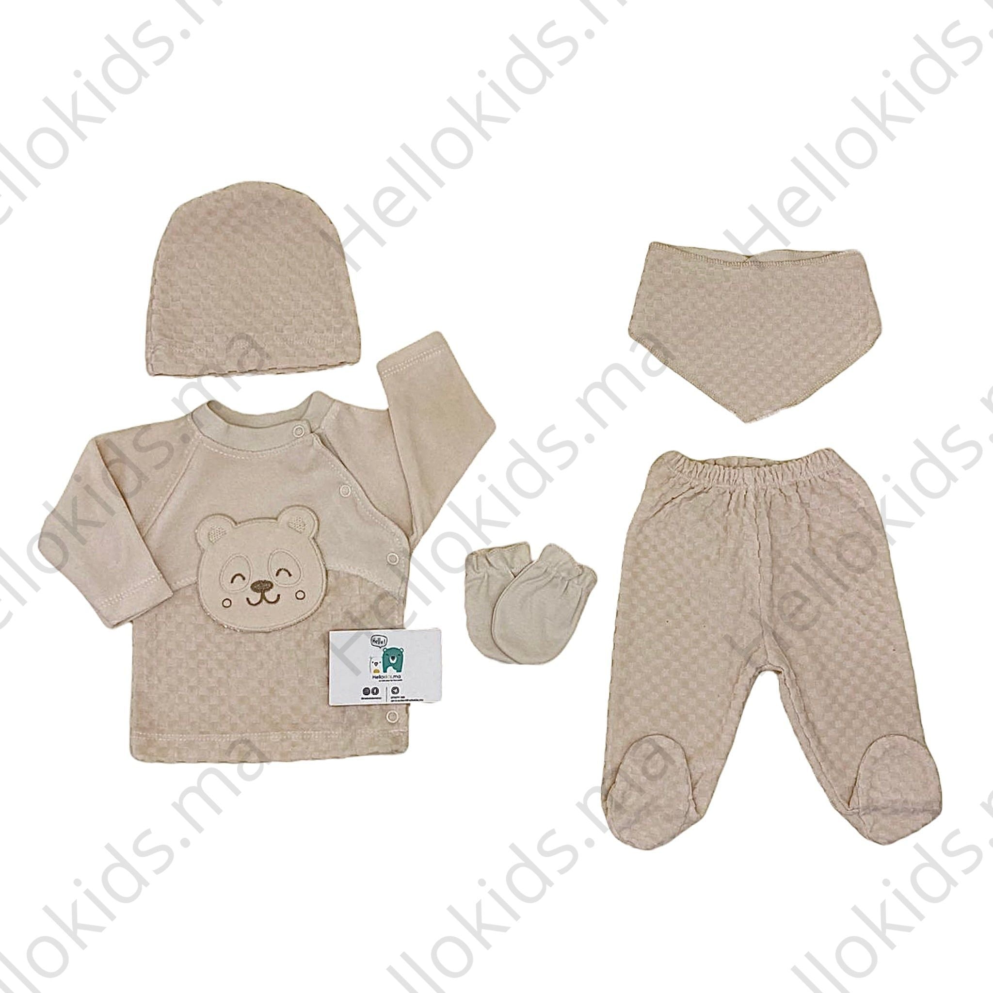 Le Pack naissance 5 pièces comprend tout le nécessaire pour habiller votre baby boy avec soin :