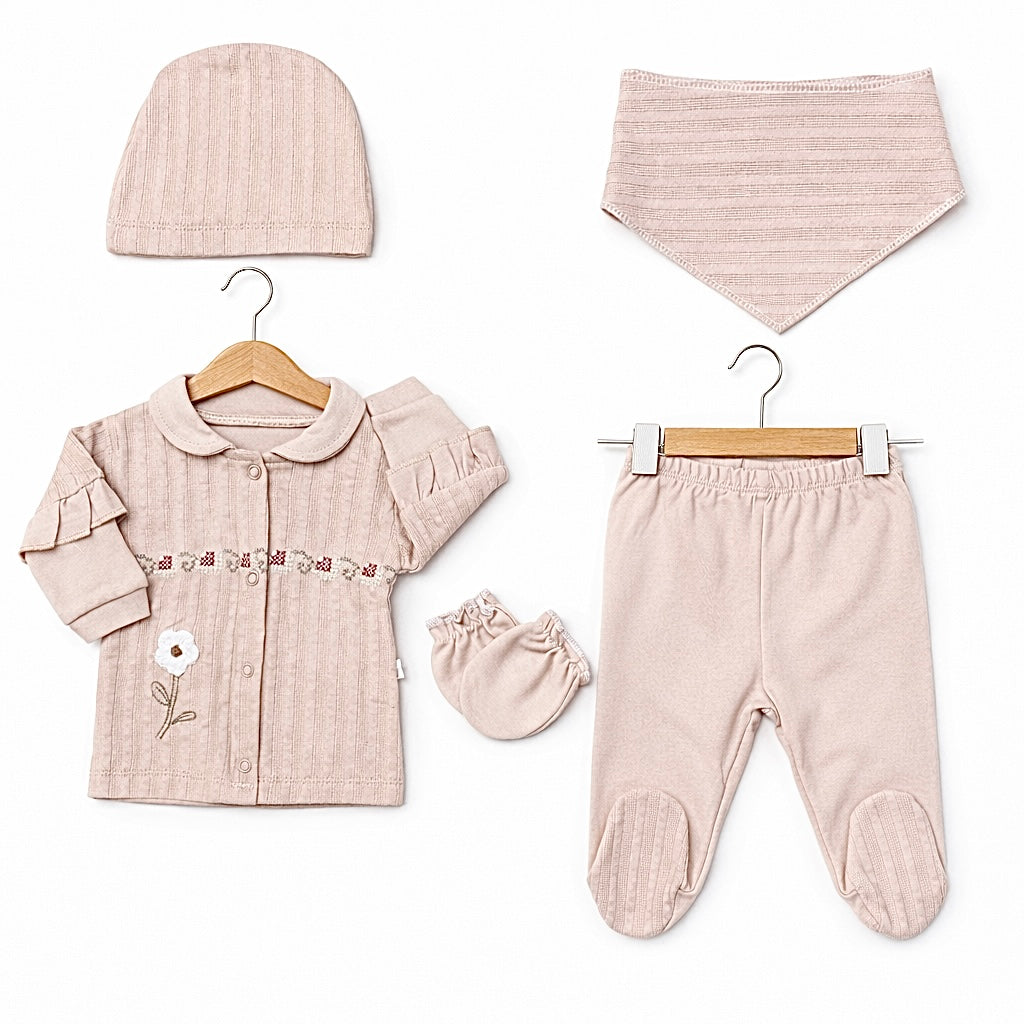 Commandez dès maintenant le Pack Naissance Jolie Fleur 5 pcs en coton sur Hellokids.ma et offrez à votre bébé un départ tout en confort et en élégance.