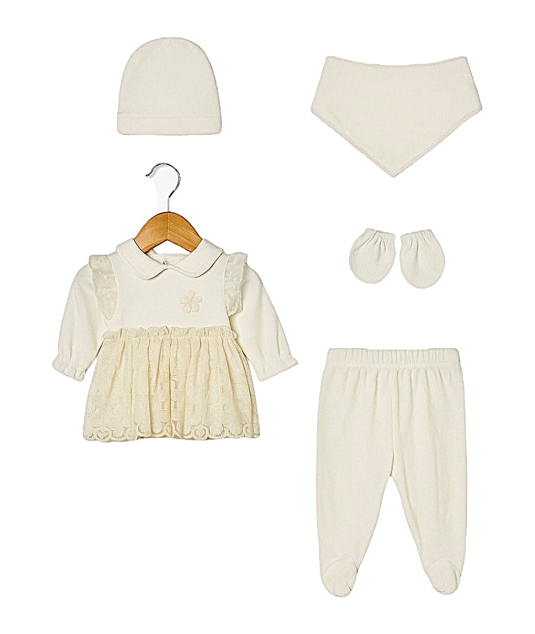 Retrouvez le Pack Naissance Jolie Fleur 5 pcs velours – blanc beige – 0/3 mois (56 cm) sur Hellokids.ma, le plus large choix naissance au Maroc.