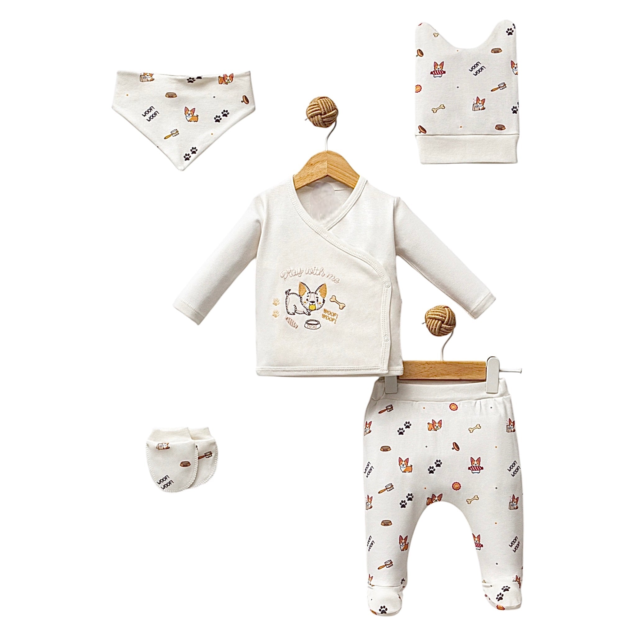 Découvrez le charmant Pack Naissance "Woof Woof" 5 pièces en coton bio, conçu pour offrir douceur et praticité aux tout-petits. Disponible dans une teinte full blanc rehaussée de délicats motifs de petits chiots, ce pack est aussi craquant qu'agréable à porter.