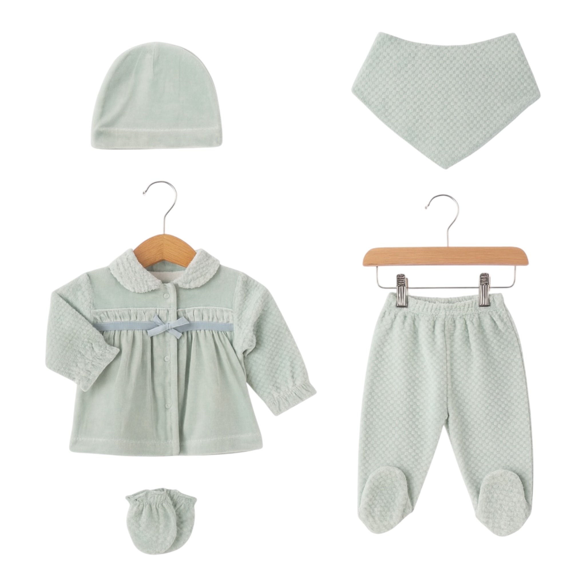Présenté avec soin, ce Pack Naissance 5 pièces en velours mint est une idée cadeau idéale pour une baby shower, une naissance ou une visite à la maternité. Élégant, pratique et intemporel.