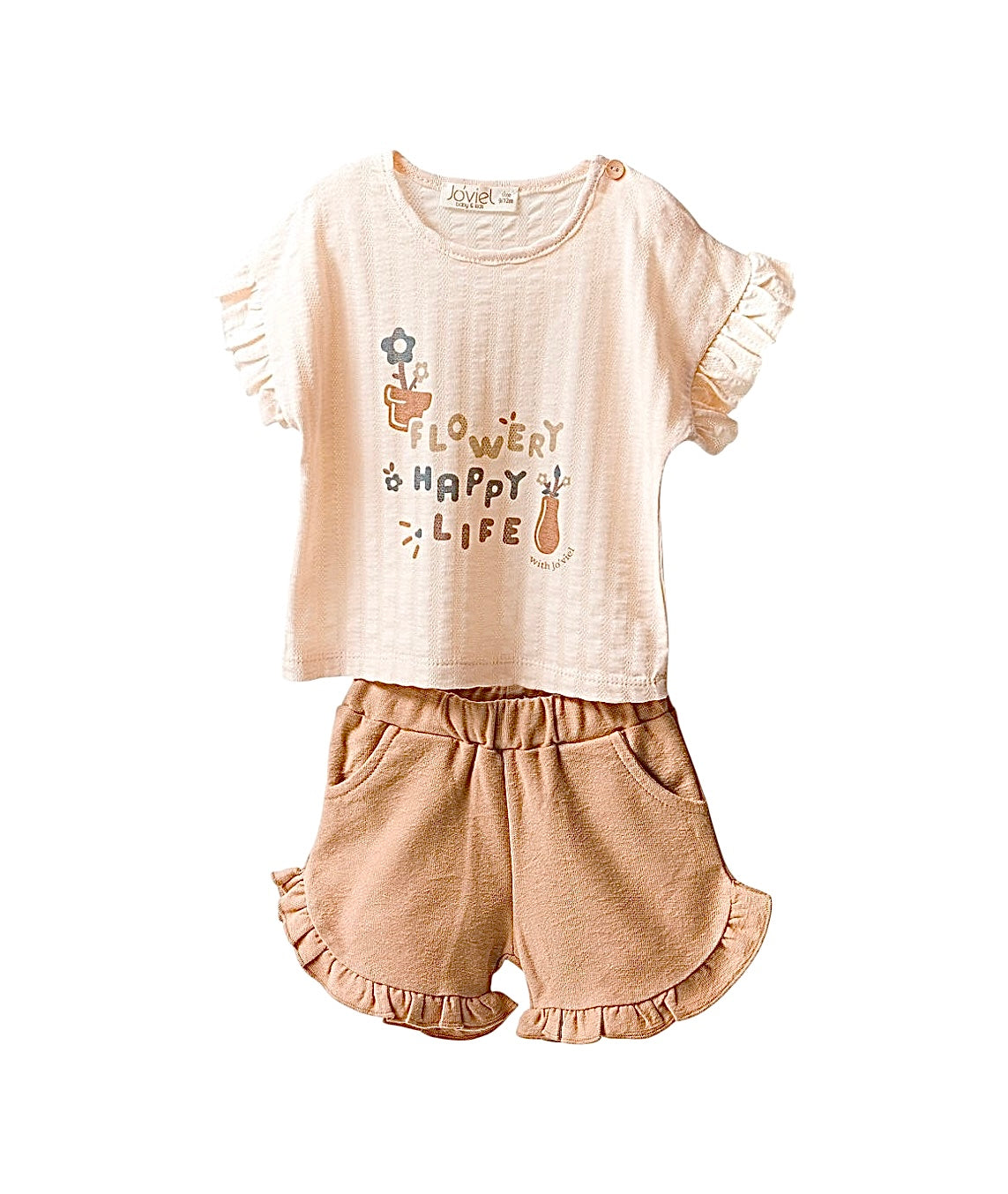 En beige rosé délicat, cet ensemble se compose d’un t-shirt à motifs fleuris et d’un short léger et tout doux, idéal pour les journées ensoleillées.