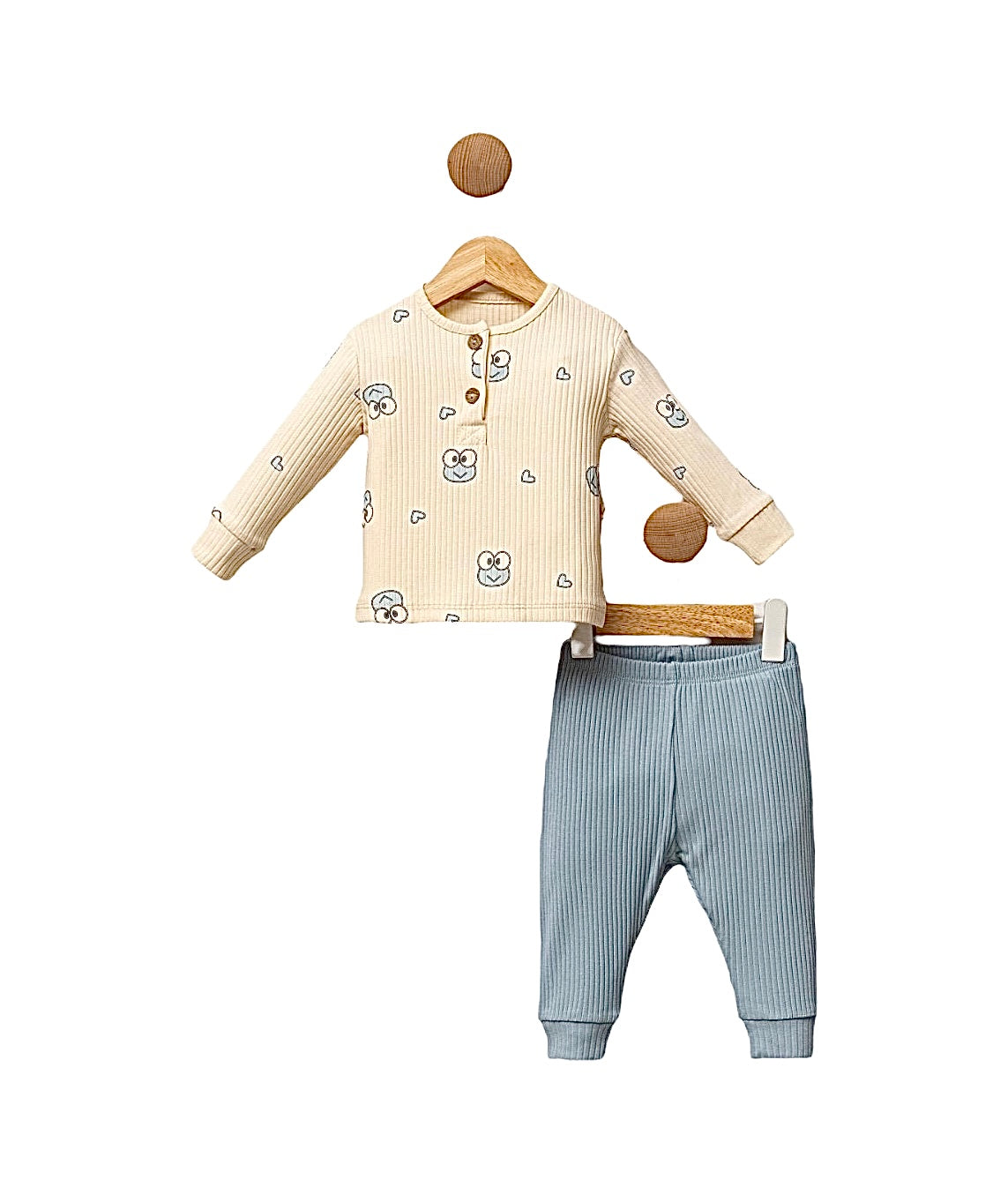 Le haut de cette tenue est décoré de motifs de grenouilles, apportant une ambiance joyeuse et fraîche. Le pantalon bleu complète parfaitement le haut beige, créant une tenue coordonnée et mignonne. Cette tenue est parfaite pour que votre petit explore son monde avec style et confort.